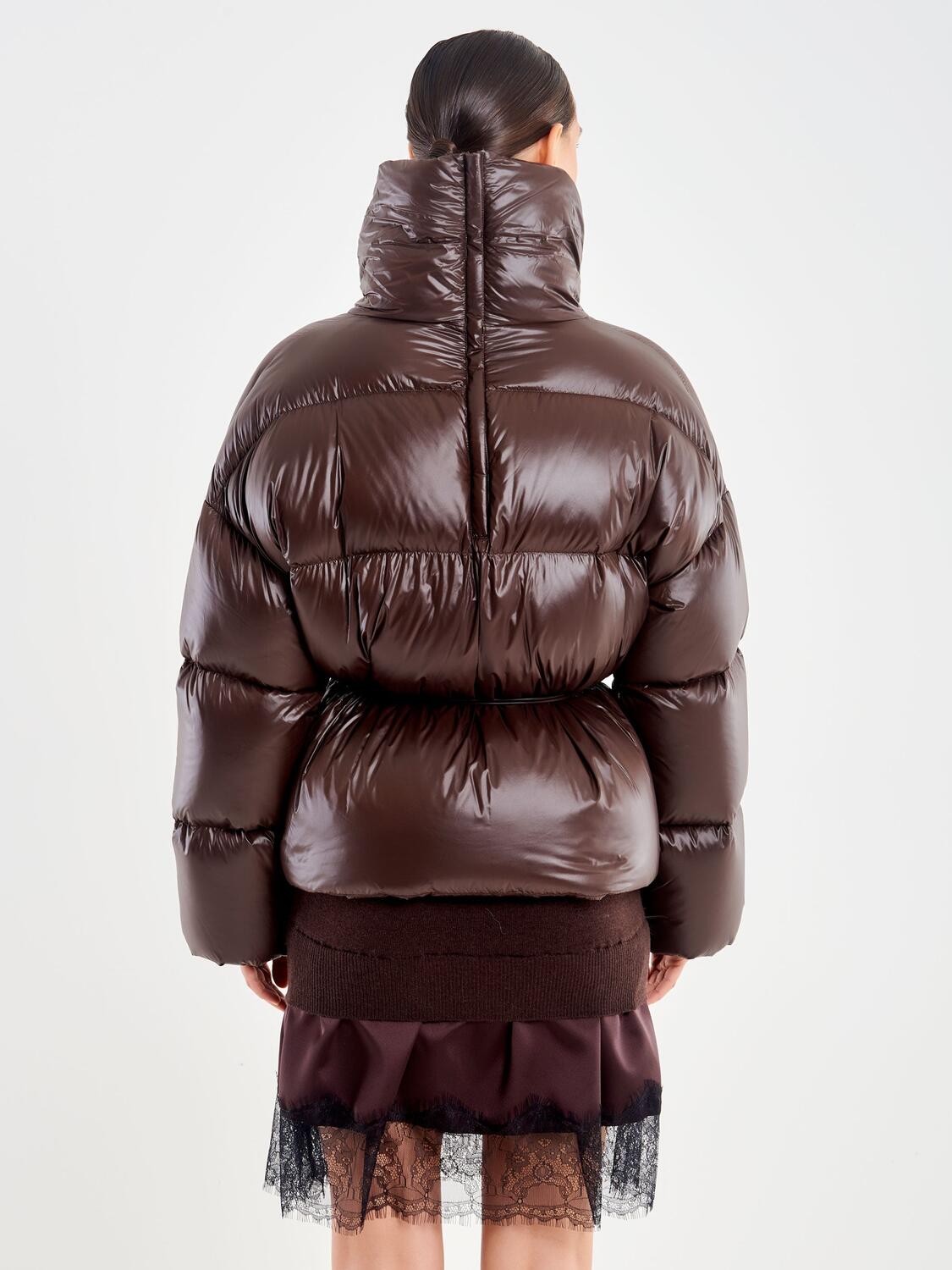 Piumino corto con cintura tubolare. Maniche lunghe con collo alto. Chiusura frontale con cerniera. Dettaglio cerniera posteriore retro collo.
